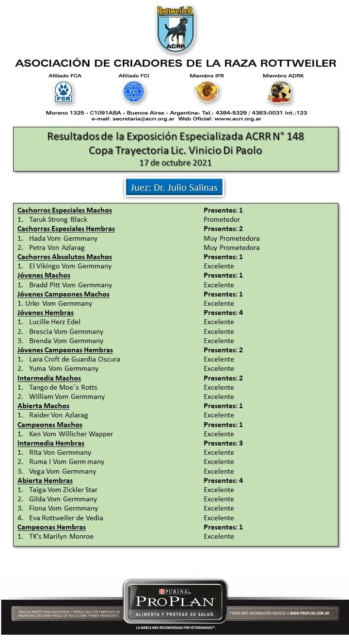 Resultados Exposiciones Especializadas 2021 + - Exposición ACRR 146 - Juez Especialista Sra. Elisa Handel Click to collapse + - Exposición ACRR 147 - Juez ACRR Sr.Pablo Piazza Click to collapse + - Exposición ACRR 148 - Copa Trayectoria Lic. Vinicio Di Paolo - Juez Especialista ACRR Dr. Julio Salinas Click to collapse + - Exposición ACRR 149 - Nacional de Cría ACRR 2021 - Juez Especialista ACRR - Lic. Vinicio Di Paolo Click to collapse Prev Next